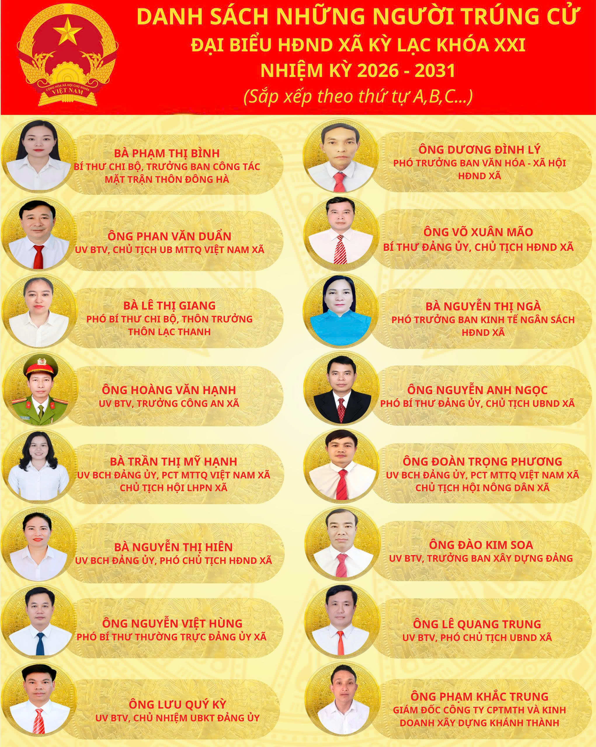 Ủy ban bầu cử xã Kỳ Lạc trân trọng giới thiệu danh sách 16 người trúng cử đại biểu HĐND xã Kỳ Lạc khóa XXI, nhiệm kỳ 2026 - 2031 (xếp theo thứ tự A, B, C...).