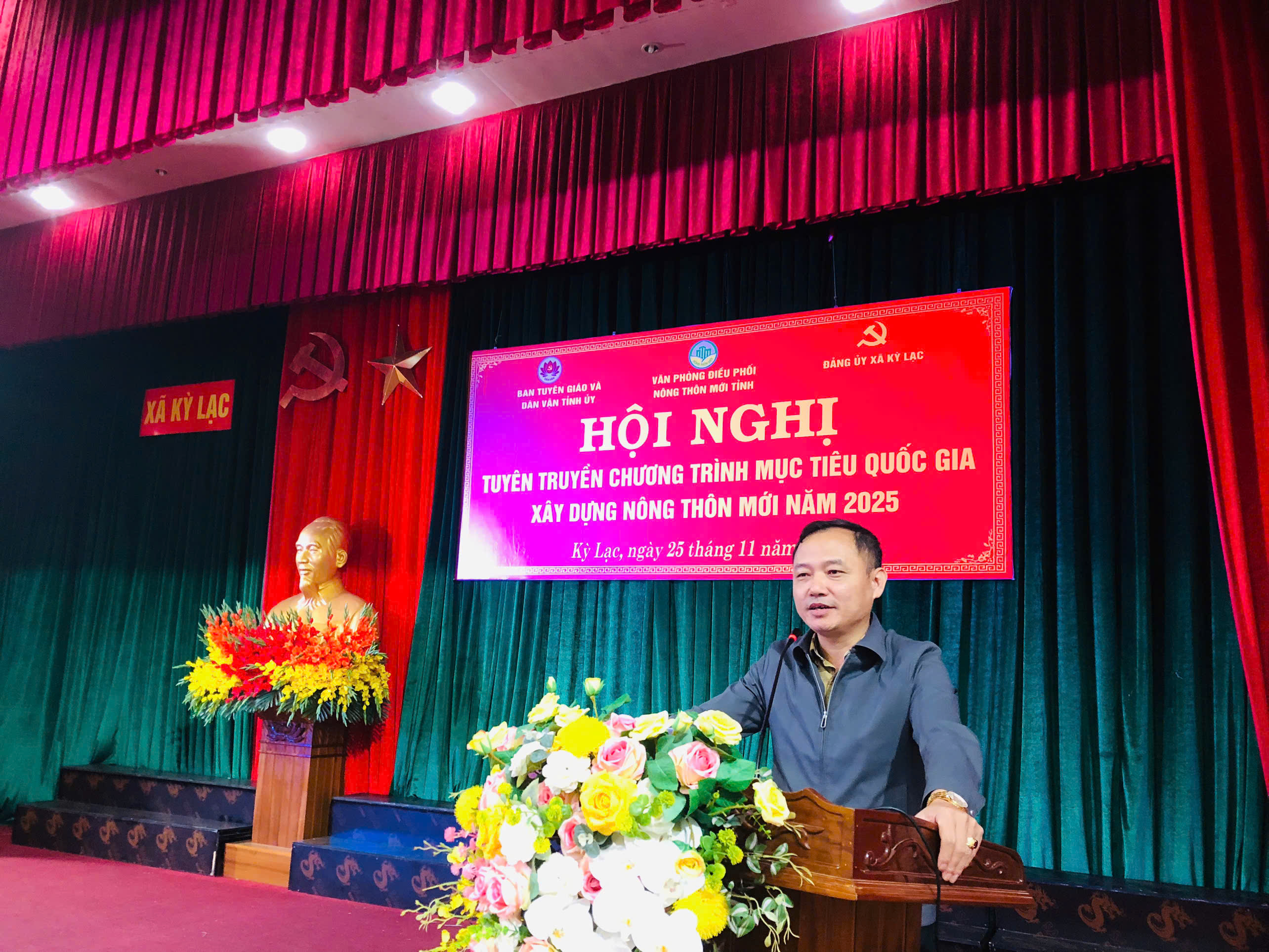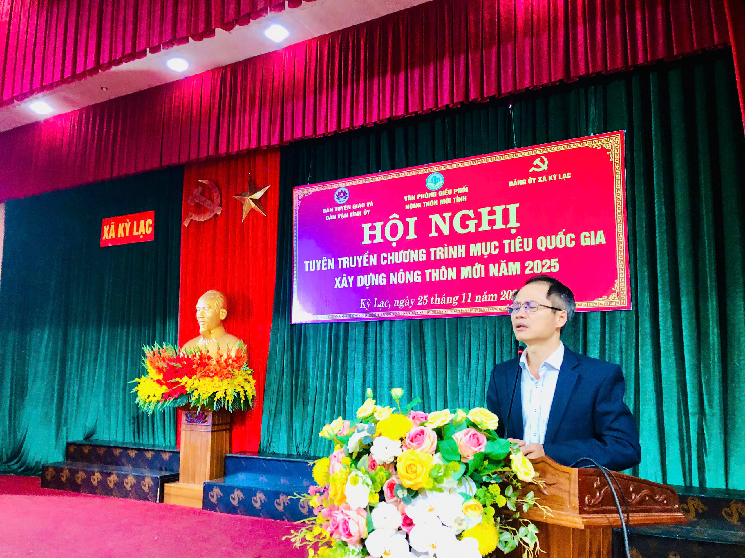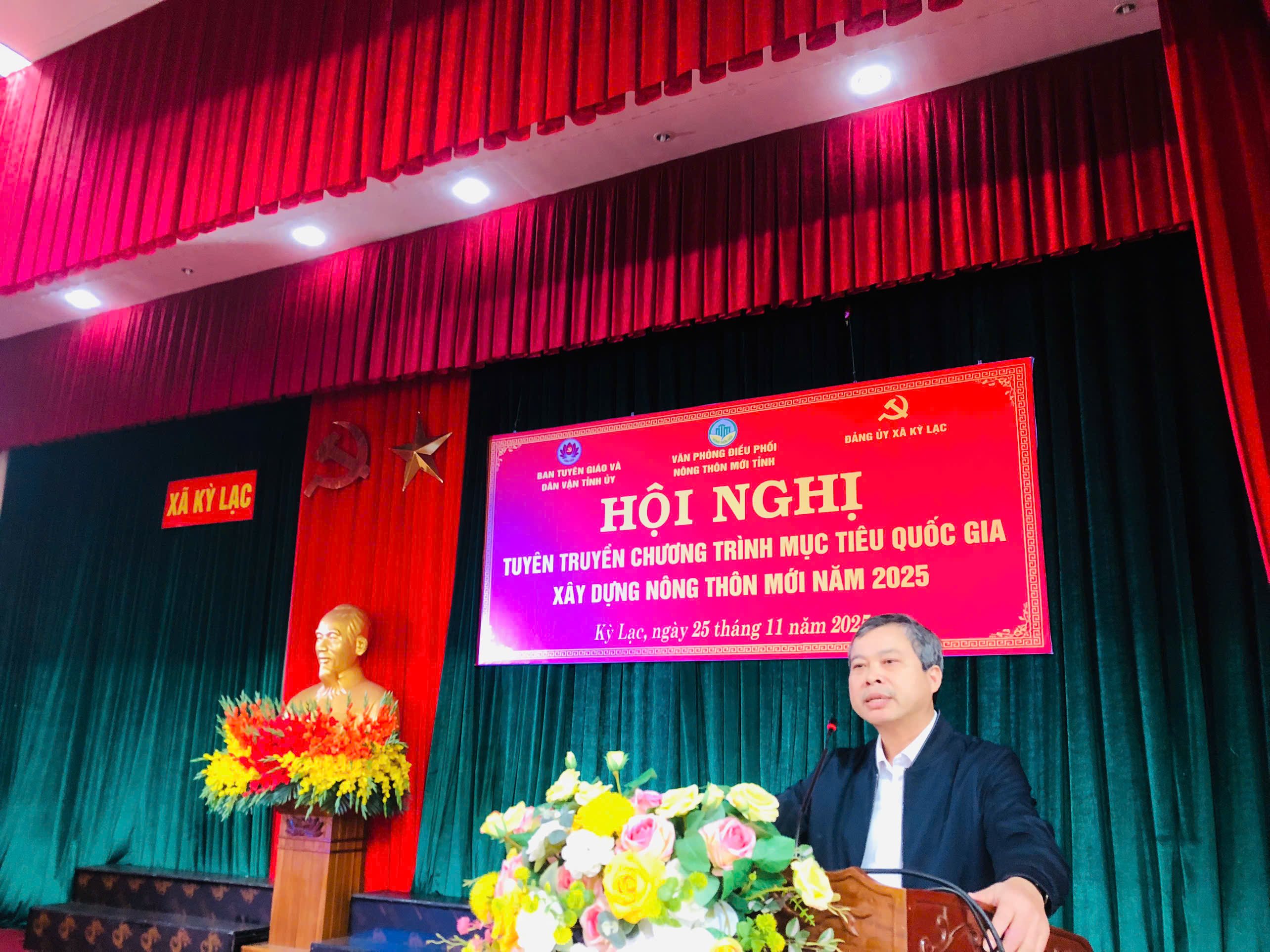 Sáng ngày 25/11/2025, Đảng uỷ xã Kỳ Lạc phối hợp với Ban Tuyên giáo và Dân vận Tỉnh uỷ; Văn phòng Điều phối Nông thôn mới tỉnh tổ chức Hội nghị tuyên truyền Chương trình MTQG xây dựng NTM năm 2025, nhằm nâng cao nhận thức và trách nhiệm của cả hệ thống chính trị, đồng thời phát huy vai trò chủ thể của Nhân dân trong phong trào xây dựng nông thôn mới.