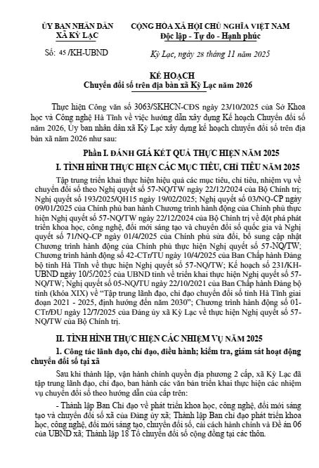 Thực hiện Văn bản số 3063/SKHCN-CĐS ngày 23/10/2025 của Sở Khoa học và Công nghệ về việc hướng dẫn xây dựng Kế hoạch chuyển đổi số năm 2026; Ủy ban nhân dân phường Sông Trí xây dựng kế hoạch chuyển đổi số trên địa bàn phường năm 2026 như sau:
