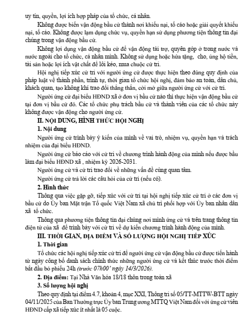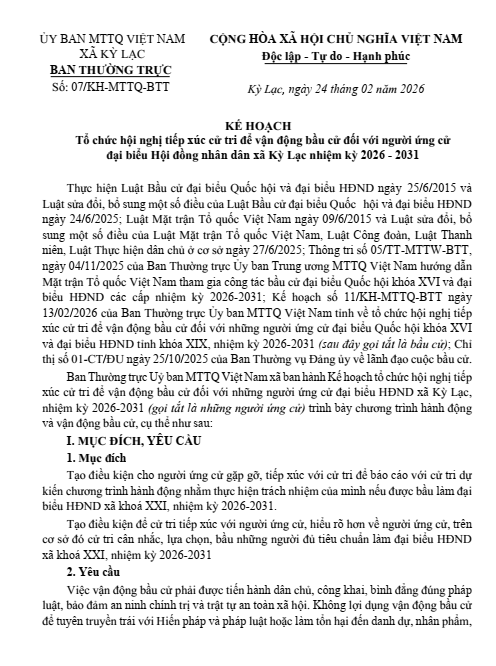 Kế hoạch và Lịch tổ chức hội nghị tiếp xúc cử tri để vận động bầu cử đối với người ứng cử đại biểu Hội đồng nhân dân xã Kỳ Lạc nhiệm kỳ 2026 - 2031Ẩn danh04/03/2026A -A+Ẩn danh04/03/2026A -A+