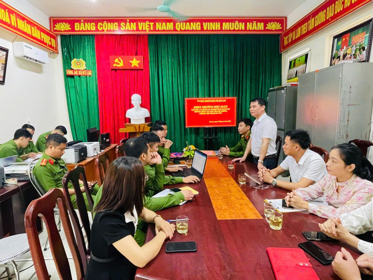 Sáng ngày 10/11/2025, các đồng chí lãnh đạo trong thường trực Đảng uỷ - HĐND - UBND xã Kỳ Lạc đã tặng hoa, giấy khen chúc mừng tập thể Công an xã khi liên tiếp bắt giữ 02 vụ 02 đối tượng có hành vi tàng trữ, mua bán trên địa bàn.