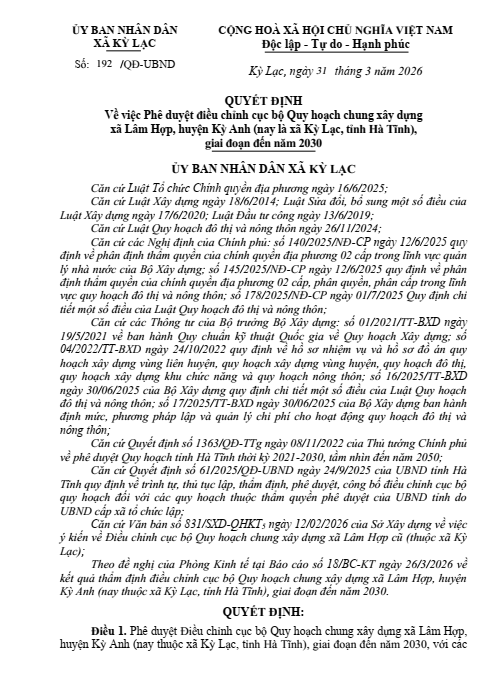 Ngày 31/3/2026, UBND xã Kỳ Lạc ban hành Quyết định số 192/QĐ-UBND về việc Phê duyệt điều chỉnh cục bộ Quy hoạch chung xây dựng