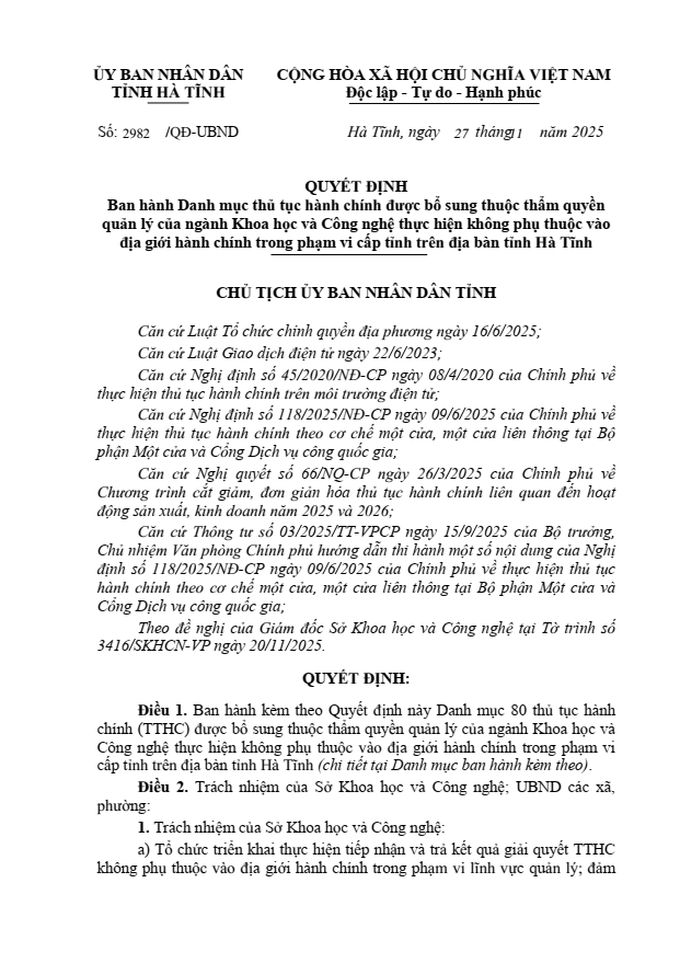 Quyết định ban hành Danh mục thủ tục hành chính được bổ sung thuộc thẩm quyền quản lý của ngành Khoa học và Công nghệ thực hiện không phụ thuộc vào địa giới hành chính trong phạm vi cấp tỉnh trên địa bàn tỉnh Hà TĩnhẨn danh01/12/2025A -A+Ẩn danh01/12/2025A -A+File đính kèm25-11-Quyet-dinh-ban-hanh-bo-sung-TTHC-phi-dia-gioi-hanh-chinh_trancongthanh-25-11-2025_10h46p15-908(27.11.2025_16h10p00)_signed.pdf